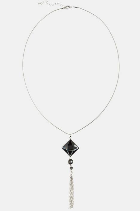 Långt halsband. Stor, slipad solitär med silverfärgad infattning. Dekorativ tofs och glänsande dekorstenar.