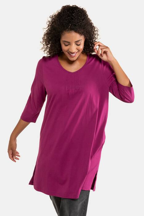 Lång topp med stråveck i den runda halsen. Trekvartsärmar, sidosprund.